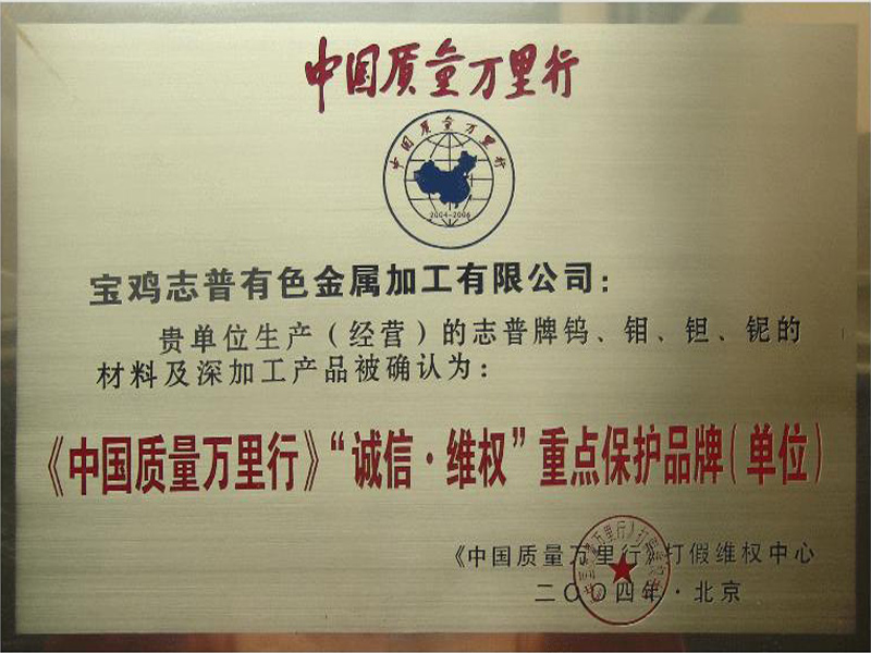 寶雞志普有色金屬加工有限公司生產(chǎn)(經(jīng)營)的志普牌鎢、鉬、鉭、鈮的材料及深加工產(chǎn)品被確認(rèn)為:《中國質(zhì)量萬里行》“誠信·維權(quán)”重點(diǎn)保護(hù)品牌(單位)