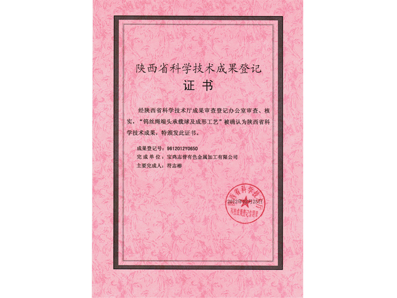 寶雞志普有色金屬加工有限公司鎢絲繩產(chǎn)品經(jīng)陜西省科學(xué)技術(shù)廳成果審查登記辦公室審查、核實,“鎢絲繩端頭承載球及成形工藝”被確認為陜西省科學(xué)技術(shù)成果,特頒發(fā)證書,成果登記號:9612012Y0650.